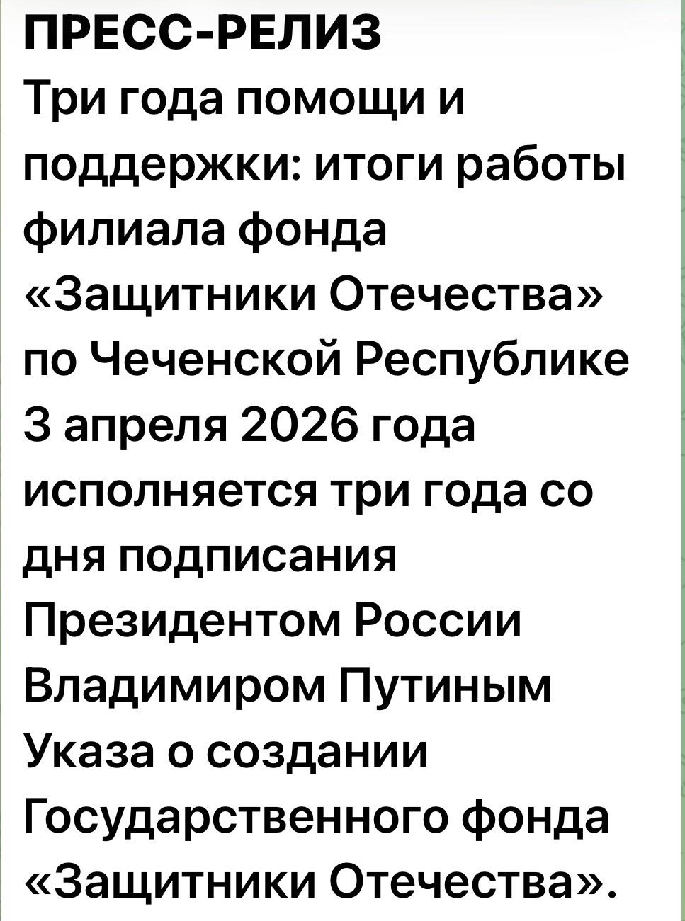 3 апреля 2026 года исполняется три года со дня подписания Президентом России Владимиром Путиным Указа о создании Государственного фонда «Защитники Отечества». За это время филиал фонда в Чеченской Республике, открывшийся 1 июня 2023 года, стал надёжной опорой для участников специальной военной операции и членов их семей. С момента начала работы в Грозный обратились более 7 тысяч человек, принято свыше 20 тысяч обращений, 98% из которых уже рассмотрены и решены положительно.