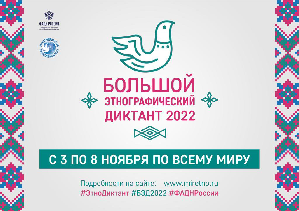 БОЛЬШОЙ О ЭТНОГРАФИЧЕСКИЙ ДИКТАНТ 2022 С 3 ПО 8 НОЯБРЯ ПО ВСЕМУ МИРУ Подробности на сайте: www.miretno.ru #ЭтноДиктант #БЭД2022 #ФАДНРоссии