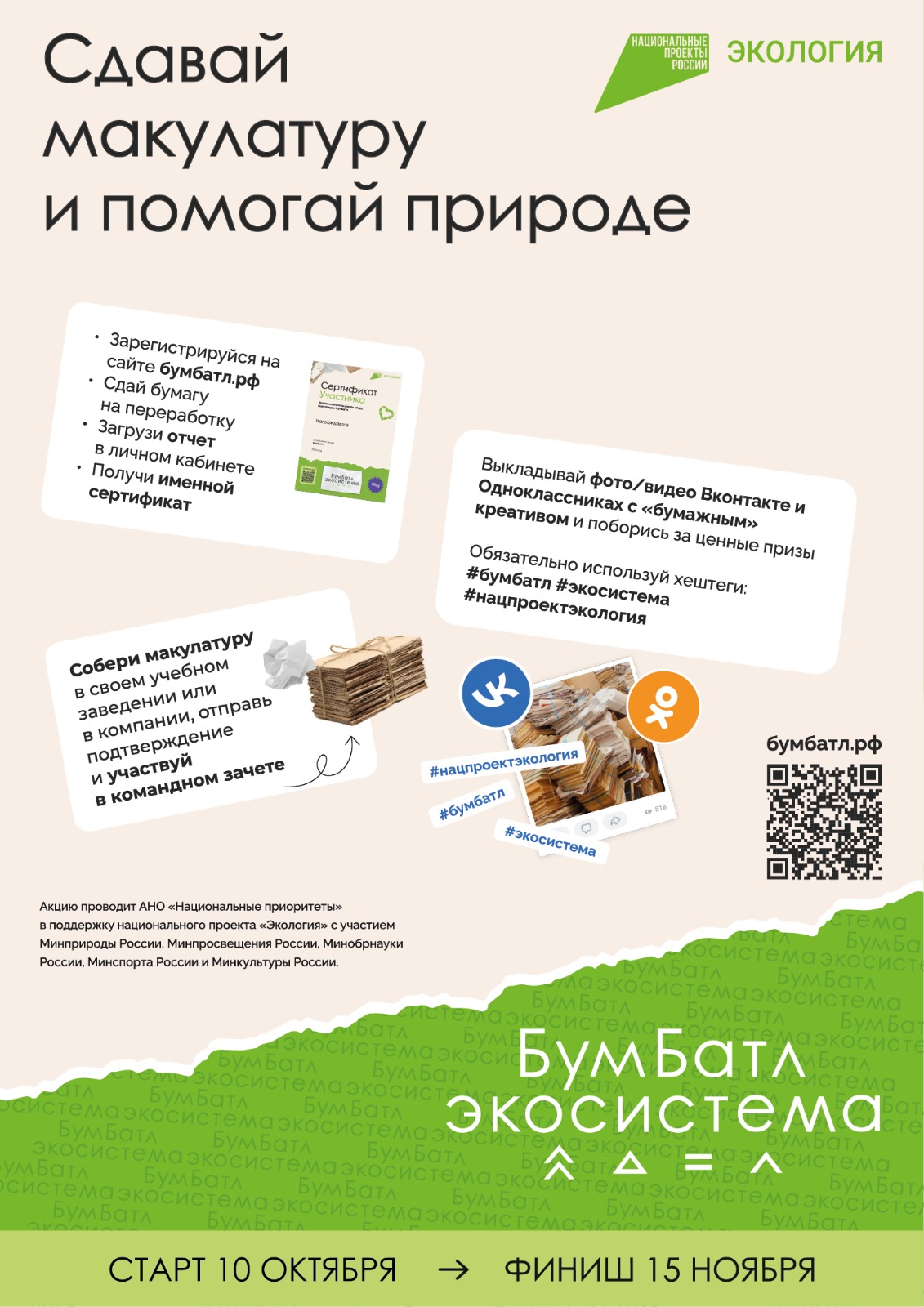 Четвертый сезон акции «БумБатл» стартует 10 октября. В этом году масштабный экологический проект организован АНО «Национальные приоритеты» совместно с Всероссийским экологическим общественным движением «Экосистема». Ключевая цель акции – сокращение излишнего потребления бумаги, организация системы ее переработки и формирование экологической культуры.